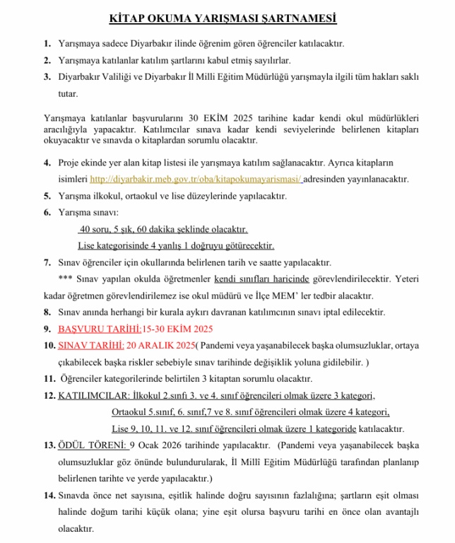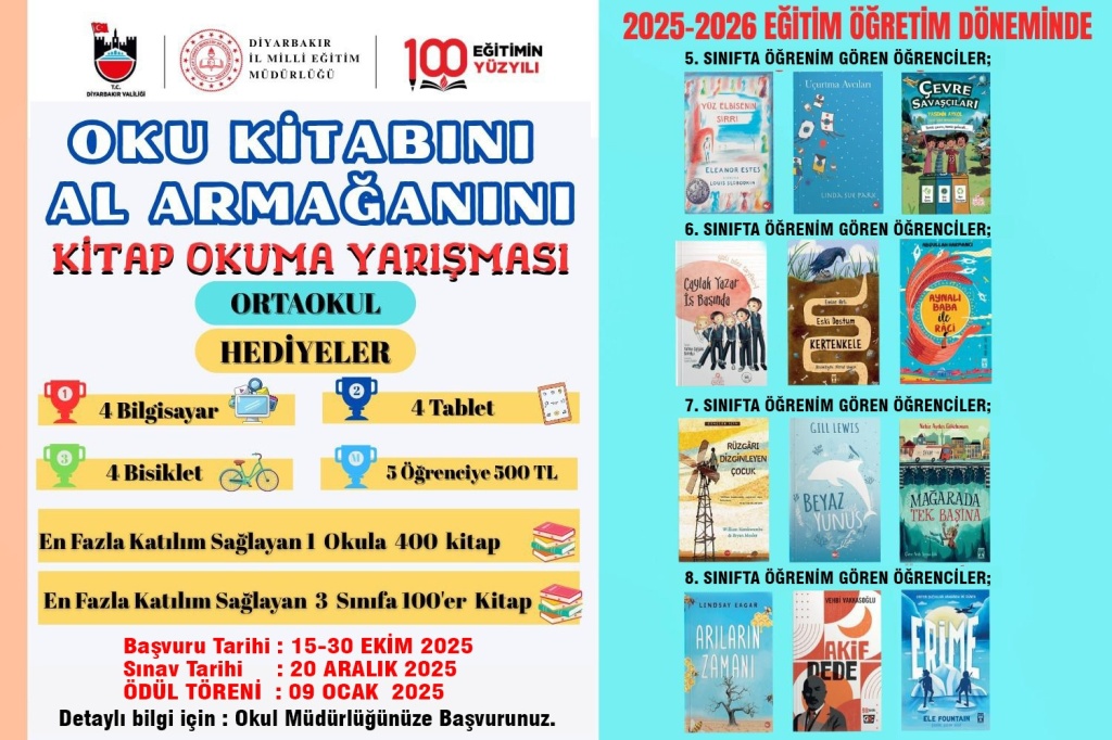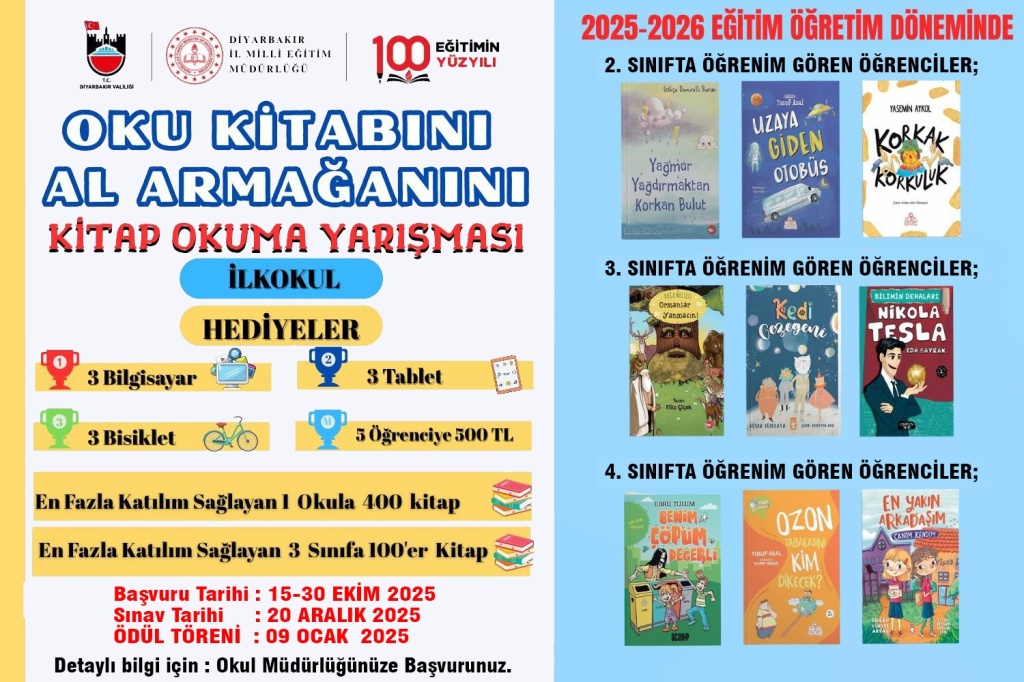 Diyarbakır İl Milli Eğitim Müdürlüğü olarak, öğrencilerimizin okuma alışkanlıklarını geliştirmek, düşünme ve anlama becerilerini desteklemek, aynı zamanda yaz tatilini akademik ve kültürel açıdan verimli geçirmelerini sağlamak amacıyla "Oku Kitabını, Al Armağanını" adlı kitap okuma yarışmasını başlatmış bulunmaktayız.